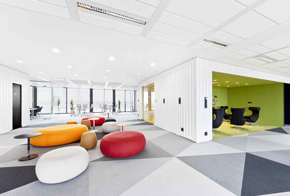 設(shè)計(jì)介紹:好玩的辦公室,體育館、娛樂(lè)室、游戲室、創(chuàng)造放松的空間,石頭型的多彩座椅,更顯趣味性,粉色的沙發(fā)是休息的法寶,并且設(shè)置的有圖書(shū)館,供人們休息室查閱,軟裝的座椅舒適,實(shí)用,還有用餐區(qū),木質(zhì)的座椅更加安全,健康,照片墻以綠色為背景顯得清晰明了,人性化,設(shè)計(jì)了體育館,員工們健身娛樂(lè)。