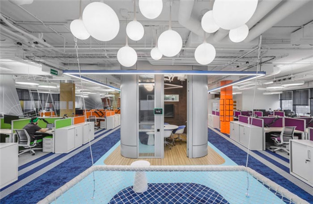 5、高科技公司辦公室裝修裝飾:以時(shí)尚美學(xué)為主題,借以模塊概念,將傳統(tǒng)辦公與未來科技相結(jié)合,打造一個(gè)具有“場(chǎng)景性、互動(dòng)性、開放性”的辦公空間,不同顏色的地毯,將分割地面并組合作為豎向交通引導(dǎo),將空間規(guī)劃因勢(shì)利導(dǎo),平面流線順理成章地向前延伸,整體規(guī)劃路線一目了然。在辦公室裝修的時(shí)候使用木飾面墻體,既是隔斷,又溫和而有力量。自然方正的形態(tài),讓整個(gè)大堂有了延長(zhǎng)性、藝術(shù)性,工整有序,流暢而舒適。大面積玻璃代替厚重墻體,輕薄的線條邊框隱匿其中,共享會(huì)議室的物理分區(qū)體量被減至小。