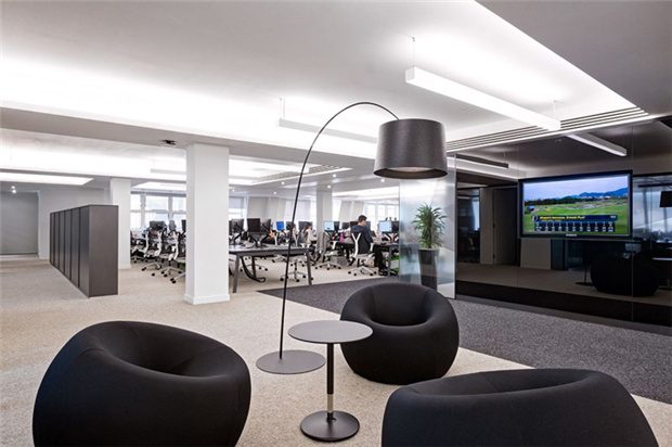 4、某知名品牌投資管理公司辦公室裝修:開放辦公區(qū)域作為整體員工工作區(qū)域,保證員工舒適性,提高工作效率,天花黑格吊頂,天花用暖色的燈裝飾,地面沒有過多的造型,整體營(yíng)造的氛圍很和諧。辦公室休閑區(qū)設(shè)計(jì):明朗的色調(diào),具有開放式的格局,員工置身于靈動(dòng)的環(huán)境下,思維打開,工作效率極高。